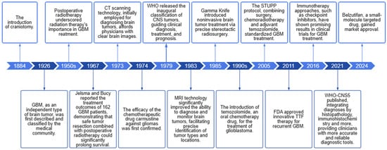 Glioblastoma (GBM) is the most prevalent malignant primary brain tumor (accounting for 13% of all tumors and 50.1% of all malignant tumors), with a 5-year survival rate of less than 7% [1,2]. Despite progress in multimodal treatments encompassing surgery, radiotherapy, chemotherapy, and targeted therapy, the overall prognosis remains unfavorable, with a median survival duration of merely 8 months [1]. Figure 1 illustrates the seminal milestones in GBM research and treatment. In a 2021 study, GBM, classified as IDH-wildtype and defined as WHO grade 4, specifically refers to diffusely infiltrative gliomas exhibiting classic histopathological features or molecular alterations [3]. Owing to its heterogeneity, aggressiveness, and the difficulty in distinguishing the malignant tissue margins compared to other solid tumors, along with the existence of the blood–brain barrier (BBB), up to 70% of patients undergo rapid disease deterioration within one year of diagnosis. Chemotherapy is one of the standardized steps in GBM treatment [4]. However, non-targeted administration often leads to low efficacy and systemic toxicity, while the presence of the BBB demands higher dosages of chemotherapeutic drugs. Developing brain-targeting drugs or formulations that can cross this barrier is urgently needed for effective treatment while minimizing toxic side effects.