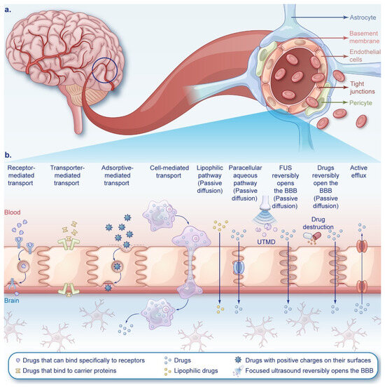 Schematic diagram of the BBB structure and the mechanism of drug entry and exit from the BBB. (a) Schematic cross-section of the BBB. (b) Schematic diagram of different mechanisms for BBB crossing. From left to right is receptor-mediated transport; transporter-mediated transport; adsorptive-mediated transport; cell-mediated transport; the lipophilic pathway (passive diffusion); the paracellular aqueous pathway (passive diffusion); focused ultrasound (FUS) reversibly opens the BBB (passive diffusion); drugs reversibly open the BBB (passive diffusion); active efflux.