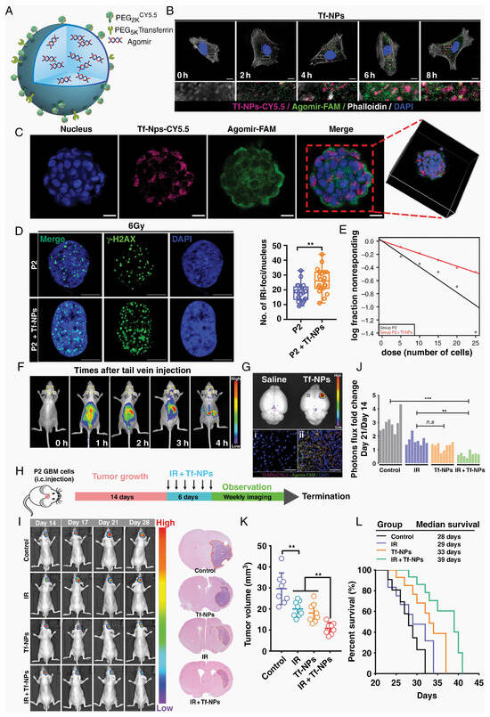 Receptor-mediated transport. RTP-targeting Tf-modified nanoparticles reverse refractory GBM and improve radiosensitivity. (A) Schematic of PEGylated agomir-loaded nanoparticles that can be functionalized to enhance transport across the BBB and target RTP cells. (B) Immunofluorescence staining demonstrating the time-dependent intracellular uptake of Tf-NPs in P2 cells. Scale bar: 10 μm. (C) Tf-NPs entering a GSC spheroid were monitored via 3D confocal laser microscopy. Scale bar: 20 μm. (D) P2 cells were treated with IR in the presence or absence of Tf-NPs, and γ-H2AX focal formation was investigated. Scale bar = 10 μm. (E) In vitro limiting dilution assay. (F,G) In vivo real-time NIR fluorescence imaging of P2 tumor-bearing mice after Tf-NP administration for indicated time periods. (H) Schematic diagram showing experimental time course and details of Tf-NP and IR treatment courses. (I) In vivo bioluminescence images of P2 tumor cells in orthotopic mice intravenously injected with Tf-NPs. (J) Statistical analysis of orthotopic tumor growth from P2 cells. (K) Quantification of tumor sizes. The data were obtained from H&E-stained brain sections of 8 mice per group. (L) Kaplan–Meier survival curves of mice intracranially injected with P2 cells (** p < 0.01, *** p < 0.001, n.s p > 0.05) [12]. Copyright 2022, Oxford University Press.
