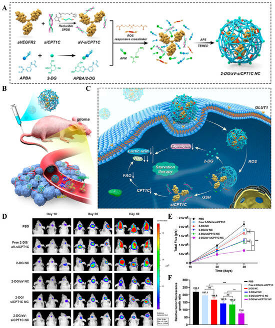 Transporter-mediated transport. (A–C) The 2-DG/aV-siCPT1C NC traverses the BBB via GLUT1 receptors to enter the CNS, thereby achieving starvation therapy for the GBM. (D–F) Biofluorescence imaging of U87-Luci glioma mice with different treatments, the quantification of glioma bioluminescence signals in each group, and the relative tumor fluorescence growth ratio for each treatment (n = 3, ** p < 0.01, *** p < 0.001, ns p > 0.05) [39]. Copyright 2023, American Chemical Society.