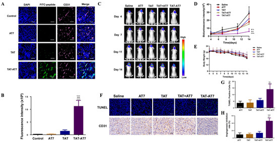 Adsorptive-mediated transport. (A–B) TAT-AT7 targeted glioma blood vessels in the intracranial glioma tissue of nude mice. Bars represent 200 μm. (C–H) TAT-AT7 inhibited the growth of gliomas in nude mice. Bars represent 100 μm (** p < 0.01, *** p < 0.001 vs. AT7 group; # p < 0.01, ## p < 0.01, ### p < 0.001 vs. TAT group; & p < 0.05, && p < 0.01, &&& p < 0.001 vs. TAT + AT7 group, % p < 0.05 vs. TAT + AT7 group) [65]. Copyright 2023, MDPI.