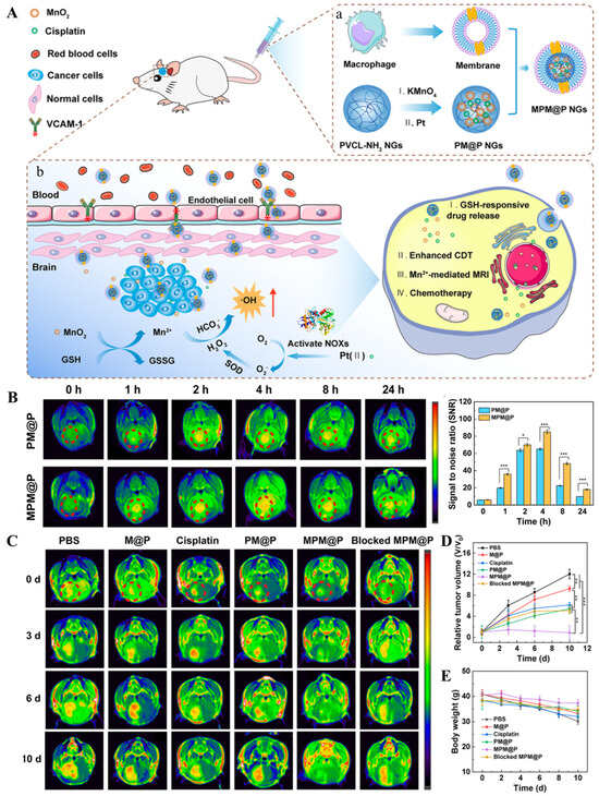 Cell-mediated transport. (A) Preparation of macrophage membrane-based biomimetic vehicles and mechanism of biomimetic MPM@P NGs crossing BBB to penetrate brain parenchyma for MR imaging-guided combination chemotherapy/chemodynamic orthotopic glioma therapy. (B) The targeted MR imaging of orthotopic glioma verified that macrophage membrane decoration facilitated the traversal of MPM@P NGs across the BBB. (C–E) Changes in tumor volume and body weight in C6 glioma-bearing mice after different treatments (* p < 0.05, ** p < 0.01, *** p < 0.001) [75]. Copyright 2021, American Chemical Society.
