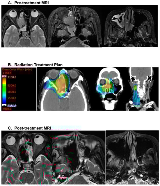 Many retrospective HNMM series reveal the consistent utilization of conventional fractionation (~2 Gy per fraction), especially in the adjuvant setting, with a well-established dose response benefit for more than 54 Gy [15]. Figure 1 demonstrates the radiation plan and subsequent treatment response following 66.01 Gy in 35 fractions to a mucosal melanoma of the right ethmoid sinus and ipsilateral neck. In addition to the common conventional schemes (60–70 Gy in 30–35 fractions), hypo-fractionation has been routinely implemented in both the definitive and palliative setting. A notable MD Anderson Cancer Center experience with MMHN utilized a hypo-fractionated regimen of 30 Gy in five fractions for oral cavity primaries, which were deemed to be a safe distance from sensitive CNS structures [16]. Subsequent data identifying improved control rates with the use of 3–4 Gy per fraction have suggested a benefit to increased biologic equivalent doses in this radioresistant histology [17,18]. Though uncommon, there are few reported uses of stereotactic body radiotherapy (SBRT) for sinonasal mucosal melanoma [19,20].