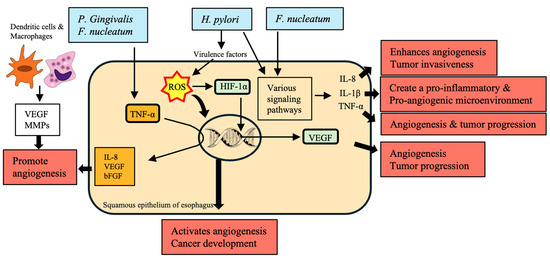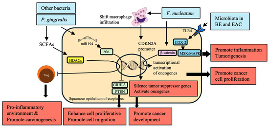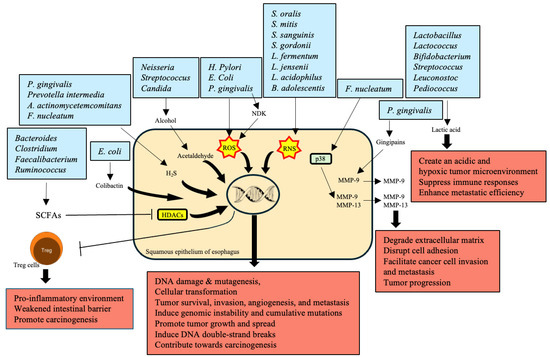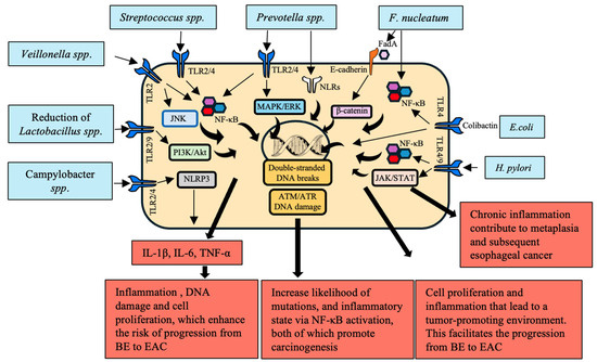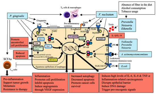 ESCC development has been linked to activating inflammatory pathways and producing cytokines, chemokines, and ROS. The LPS of Gram-negative bacteria, such as P. gingivalis and F. nucleatum, binds to TLR-4 on immune cells and activates the MyD88-dependent pathway, leading to the activation of NF-κB and the production of pro-inflammatory cytokines IL-1β, IL-6, IL-8, TNF-α in ESCC [62,66,67]. Additionally, P. gingivalis activates the ERK1/2–Ets1 and PAR2/NF-κB pathways, while the activation of the NOD1/RIPK2/NF-κB and NLRP3 inflammasome pathways acts as downstream effectors for F. nucleatum. Inflammatory pathways that become activated destabilize the epithelial barrier and activate the host’s DNA damage and pro-oncogenic signals, triggering the carcinogenesis process [56]. More so, the persistency of NF-kB activation is promoted by the continuous exposure to microbial products for the host immune cells, causing increased inflammation, cell proliferation, protection of cells from apoptosis, and inducing angiogenesis through vascular endothelial growth factor (VEGF) expression [57]. Chronic inflammation resulting from pathogenic microbiota increases the levels of pro-inflammatory cytokines, which contribute to ESCC development. TLRs are activated by Escherichia coli, the most prevalent organism in both BE and EAC, suggesting that this organism has an early role in carcinogenesis [63]. In addition, A. actinomycetemcomitans generates factors that exaggerate inflammation and cancer hazard [64].