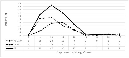 - Al Saleh, A.S.; Sidiqi, M.H.; Gertz, M.A.; Muchtar, E.; Lacy, M.Q.; Warsame, R.M.; Gonsalves, W.I.; Kourelis, T.V.; Hogan, W.J.; Hayman, S.R.; et al. Delayed neutrophil engraftment in patients receiving Daratumumab as part of their first induction regimen for multiple myeloma. Am. J. Hematol. 2020, 95, E8–E10. [Google Scholar] [CrossRef]
