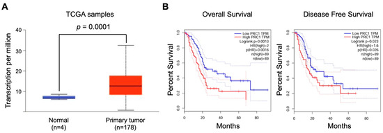 Gene expression profiling interactive analysis (GEPIA) is a web server based on TCGA that analyzes RNA sequencing expression across various cancer types [22]. GEPIA offers interactive and adaptable functions, including distinctive expression analysis, profiling plotting, correlation, patient survival, and more analysis. Analysis of PRC1 was performed with the overall survival and disease-free survival of pancreatic cancer patients using GEPIA. HR denotes Hazard Ratio and TPM means Transcripts Per Million. GEPIA is available at http://gepia.cancer-pku.cn/ (accessed on 1 July 2024).