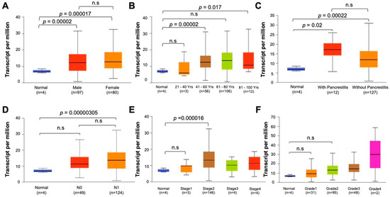 The University of Alabama at Birmingham Cancer Data Analysis Portal (UALCAN) utilizes data from the TCGA database to evaluate protein-coding gene expression and its impact on patient survival across 33 types of cancer [21]. Analysis of PRC1 was performed in pancreatic cancer based on sample type, patient sex, age, chronic pancreatitis status, nodal metastasis status, cancer stage, and tumor grade by UALCAN. UALCAN is publicly available at http://ualcan.path.uab.edu (accessed on 1 July 2024).