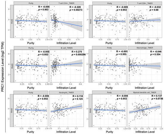 TIMER is a program for the comprehensive analysis of tumor-infiltrating immune cells across various cancer types [23]. This web server provides estimates of immune infiltrates’ abundances using multiple immune deconvolution methods and allows for the dynamic generation of high-quality figures to explore tumor immunological, clinical, and genomic features based on TCGA data in human genes. The relationship between PRC1 gene expression levels and KRAS or TP53 was analyzed in pancreatic cancer using TIMER. Timer database analysis is available at http://timer.cistrome.org/ (accessed on 1 July 2024).