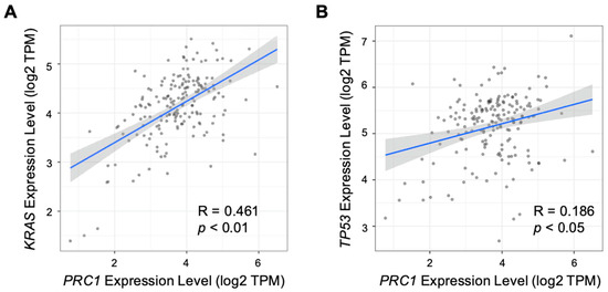 Pancreatic cancer is typically classified as a “cold” tumor, which has a low response rate to immunotherapy [25,26,27]. Moreover, pancreatic cancer has a high heterogeneity tumor microenvironment, which can increase resistance to immunotherapy and reduce the infiltration of immune cells [28]. Various approaches have been explored to enhance the efficacy of immunotherapy, including combination therapies and strategies to increase tumor immunogenicity. The immune cell infiltration number, especially T cells within the tumor, is one of the measurements of immunogenicity. We examined the relationship between PRC1 expression and immune cell infiltration in pancreatic cancer using the TIMER database. Our analysis revealed that PRC1 expression does not significantly correlate with CD8+ T cells (R = −0.032, p = 0.68), macrophages (R = −0.046, p = 0.554), neutrophils (R = 0.118, p = 0.125), or dendritic cells (R = 0.137, p = 0.0736) (Figure 3). However, PRC1 was found to have a weakly negative correlation with CD4+ T cells (R = −0.228, p = 0.00273). Interestingly, PRC1 has a positive correlation with B cells (R = 0.275, p = 0.000296) but a weak correlation. These findings suggest that PRC1 regulates immune cell infiltration within the tumor microenvironment, especially CD4+ T cells. Therefore, targeting PRC1 may enhance the efficacy of immunotherapy in pancreatic cancer by modifying the immune landscape of the tumor. Several key markers are associated with pancreatic cancer, including KRAS, TP53, and SMAD4 [29,30,31]. We investigated the correlation between PRC1 and these markers in pancreatic cancer. Our analysis revealed that PRC1 is positively correlated with KRAS (R = 0.461, p < 0.01) and TP53 (R = 0.186, p < 0.05) (Figure 4A,B). These findings suggest that PRC1 may be an additional target gene in pancreatic cancer.
