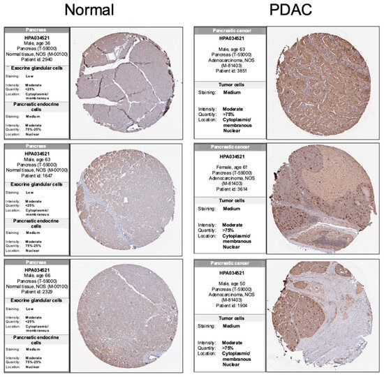 The Human Protein Atlas (HPA) focuses on the expression profiles in human tissues of genes both on the mRNA and protein levels. The protein expression data from 44 regular human tissue types are obtained through antibody-based protein profiling using conventional and multiplex IHC [24]. Images of IHC-stained tissue samples are manually annotated for staining intensity, fraction of cells stained, less than 25%, 25–75%, or more than 75%, and relevance to each tissue type and subcellular localization (nuclear and/or cytoplasmic/membrane) of the commented-on cell type. To analyze the PRC1 expression levels, IHC images of PRC1 expression in pancreas and pancreatic cancer were obtained from the HPA. The HPA is available at https://www.proteinatlas.org/ (accessed on 1 July 2024).