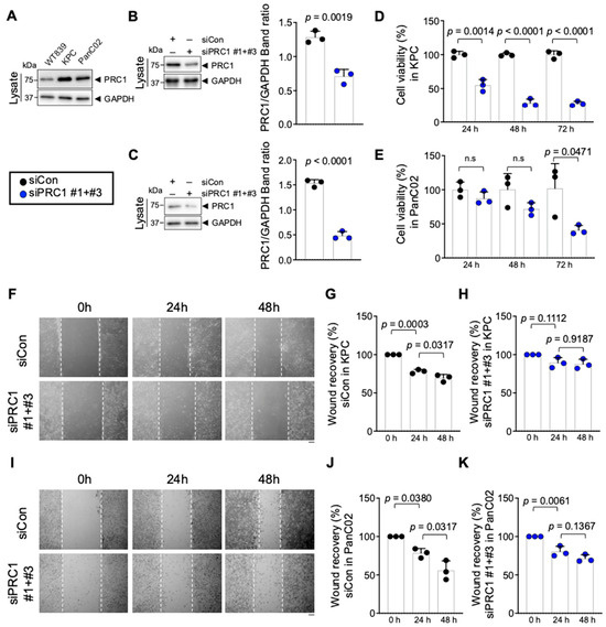 Effect of PRC1 expression on pancreatic cancer cell lines growth inhibition. (A) Protein expression of PRC1 in both normal and pancreatic cancer cell lines. (B) (Left) Knockdown of PRC1 protein level in KPC cell lines. (Right) The ratio of PRC1/GAPDH protein band intensity was quantified from the three blots shown on the left with two more experiments (n = 3). (C) (Left) Knockdown of PRC1 protein level in PanC02 cell lines. (Right) The ratio of PRC1/GAPDH protein band intensity was quantified from the three blots shown on the left with two more experiments (n = 3). (D) Measurement of the viability of KPC cells with PRC1 expression at different time points (n = 3). (E) Measurement of the viability of PanC02 cells with PRC1 expression at different time points (n = 3). (F) Representative images of wound healing assay of KPC cell lines with PRC1 expression at different time points. Measurements of wound healing recovery rates in (G) control cells group (n = 3) and (H) PRC1 knockdown KPC cells group (n = 3). (I) Representative images of wound healing assay of PanC02 cell lines with PRC1 expression at different time points. Measurements of wound healing recovery rates in (J) control cells group (n = 3) and (K) PRC1 knockdown cells group (n = 3). Graphs show mean + SD, n.s; not significant, p < 0.05: significant. All Western blot images’ raw data were provided in the Supplementary Materials. For (B–E), unpaired t-test. For (G,H,J,K), one-way ANOVA and Tukey’s multiple comparisons test. Scale bar: 100 μm.