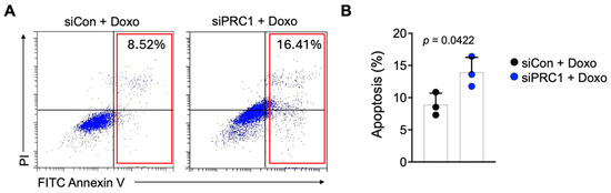 After PRC1 knockdown with siRNA, PanC02 cells were treated with 2 µM doxorubicin. The following day, all medium and cells were collected using a scraper with PBS. The cells were centrifuged at 1500× g rpm for 5 min. Samples were resuspended with 1 × binding buffer (BD Bioscience, Franklin Lakes, NJ, USA, catalog no. 5166121E). The samples were stained with FITC annexin V staining buffer and PI buffer (BD Bioscience, catalog no. 556547) for 15 min at room temperature. Samples were analyzed by using a Cytoflex S (Beckman Coulter, Brea, CA, USA).