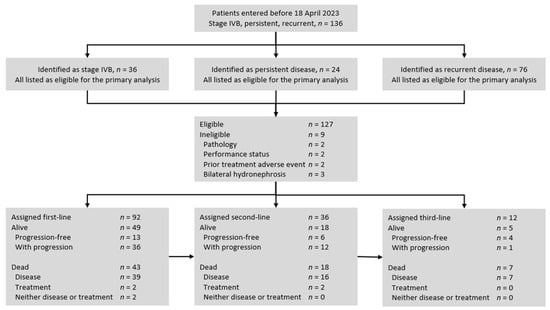 From November 2002 to April 2023, 136 patients were identified with metastatic (untreated stage IVB), persistent, or recurrent uterine cervix cancers (Figure 1). The primary analyses excluded a total of nine patients, which included two patients for an atypical pathology (small cell or neuroendocrine), two patients for a performance status greater than ECOG 2 (from central nervous system metastases), two patients for a prior treatment adverse event precluding the first-line treatment, and three patients for a bilateral hydronephrosis that could not be alleviated by ureteral stents or percutaneous nephrostomy. No patients were found to be ineligible for having a concurrent or past malignancy. After the exclusions, 127 (93%) patients were evaluable for progression-free survival interval(s). Of the 127 patients, 120 (94%) had completed prior cisplatin and radiotherapy for the primary disease; 22 (18%) had persistent primary uterine cervix cancer identified in a previously irradiated field. Patient, tumor, and treatment characteristics are summarized in Table 1. Treatments administered during the study period are listed in Table 2. Median follow-up was 18 months (25–75% interquartile range: 9 to 37 months).