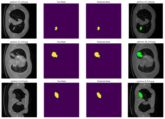 Figure 3. The sample prediction results are presented in the following order: first, the original image with its filename; second, the true mask of the tumor region; third, the predicted mask generated by the segmentation model; and finally, a combined image displaying all three. In the combined image, the masks are overlaid onto the original image, with green indicating correctly predicted tumor areas, blue showing missed actual tumor regions, and red highlighting healthy areas mistakenly classified as tumor.