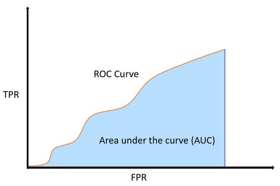 The ROC curve is a graph taking the true positive rate (TPR), Equation (5), as y-axis and the false positive rate (FPR), Equation (6), as x-axis. The area under the curve (AUC) represents the area beneath this curve. A higher AUC signifies a stronger overall ability of the model to differentiate positive and negative prediction sets from one another. The higher the value of ROC AUC, the better the model performs, as shown in Figure 4.