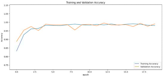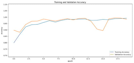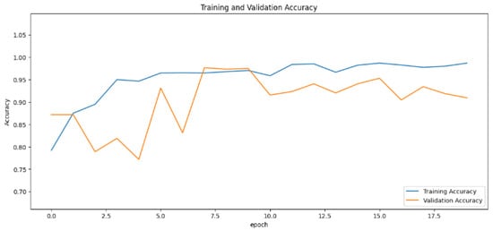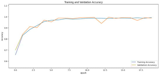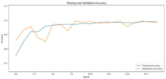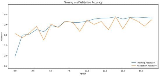 The accuracy values for all models and datasets during the classification phase vary depending on the specific model. Observations from the learning curves reveal distinct patterns. The learning curves of the models MobileNet V2 and VGG-19 models indicate that the learning and mastery process for these models is generally moderate, as shown in Figure 5 and Figure 6 with high–low oscillations in validation. The ResNet152V2 model exhibited a gradual increase in accuracy during the initial training periods, followed by stability, as depicted in Figure 7. For the Xception, InceptionResNetV2, and InceptionV3 models, a significant jump in accuracy was observed early in the training process, and these models maintained their accuracy rates with very small oscillations thereafter, as seen in Figure 8, Figure 9 and Figure 10.