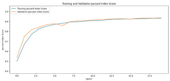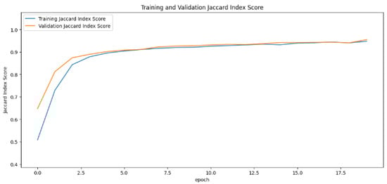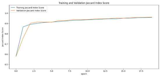 In the segmentation phase, the Jaccard index measures the ratio of the intersection of two clusters to their union. Known as “Intersection over Union (IoU)” as well, this metric is widely used in segmentation tasks. The Jaccard index varies between 0 and 1, with 1 signifying complete overlap between the clusters and 0 indicating no overlap. A high Jaccard index means that the segments predicted by the model closely match the actual segments. This metric is particularly valuable for evaluating the accuracy of segmented areas in an image, as illustrated in Equation (7).