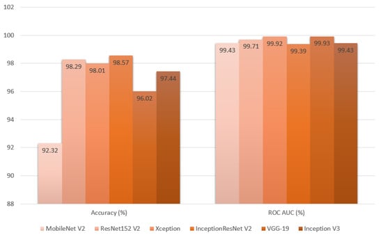 In the final evaluation section, the results from the test dataset were thoroughly analyzed, enabling an objective comparison of each metric based on the model used in the initial stage of image classification. The InceptionResNetV2 model achieved the highest accuracy at 98.57%, while the Xception model recorded the lowest loss value at 0.03. When assessing precision (98.61%), recall (98.54%), and F1 score (98.58%), the InceptionResNetV2 model again delivered the best results. Additionally, the VGG-19 model achieved the highest ROC AUC value at 99.93%. Overall, the InceptionResNetV2 model emerged as the top performer across all metrics, with the exception of the ROC AUC value. For a detailed comparison, refer to Table 3, along with Figure 14, Figure 15 and Figure 16.