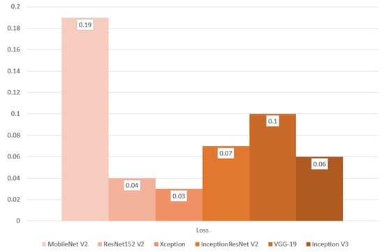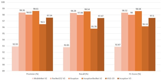 As shown in Table 3 and Figure 14, Figure 15 and Figure 16, the InceptionResNetV2-based model outperformed the others across most metrics, emerging as the best overall. It not only achieved the highest accuracy but also excelled in precision, recall, and F1-Score, indicating a well-balanced performance. The accomplishment of the model can be credited to its implementation of residual mapping, which helps alleviate challenges associated with being a “very deep model” and the integration of parallel convolutional layers at the end of each inception block. This combination of techniques in InceptionResNetV2 led to the best results in this study. The only exceptions were its performance in the ROC AUC metric, where it ranked last, and its average loss, which was not the lowest.