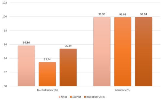 The test dataset, generated from the classification process, proceeds to the segmentation stage, where the results are evaluated using various metrics. During this evaluation, each metric is objectively analyzed according to the selected model. The UNet model achieved the highest performance, with a Jaccard Index value of 95.86%. The InceptionUNetV2 model followed closely with 95.39%, while the SegNet model also exhibited strong performance, achieving a rate of 93.44%. See Figure 17 and Figure 18, along with Table 4.