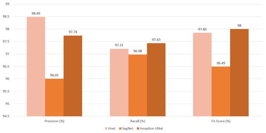 Upon examining the results across all metrics, it is evident that the InceptionResNetV2 and Inception UNet models achieved the highest performance in the study. In contrast, the MobileNetV2 and SegNet models were observed to produce the lowest results among their counterparts.