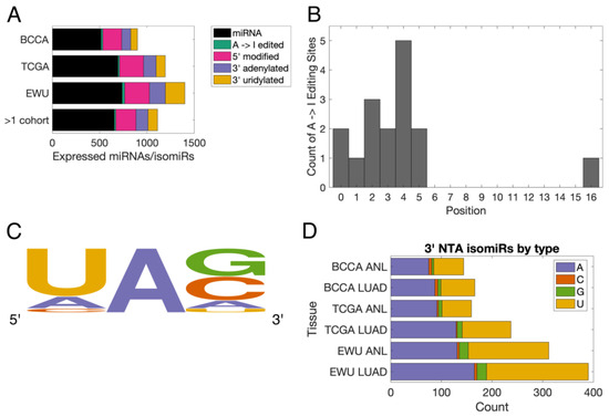 Basic characteristics of the lung isomiRome. (A) Bar chart illustrating the numbers of miRNAs and different types of isomiRs that were expressed in each lung cohort. The bottom row indicates the numbers of high-confidence miRNAs/isomiRs. The bar graph includes isomiRs that are expressed in ANL and LUAD samples in the individual cohorts. (B) Histogram indicating the positions of the 16 high-confidence A-to-I editing sites. Position ‘0’ corresponds to the first nucleotide of a miRNA. (C) Plot of the nucleotides located immediately 5′ and 3′ of the high-confidence editing sites, with the height of a letter being proportional to its frequency. Generated using WebLogo (v.2.8.2) [45]. (D) Bar chart indicating the numbers of isomiRs with 3′ non-templated addition (NTAs) of each nucleotide that was expressed in each sample group. ANL: Adult Non-malignant Lung; BCCA: British Columbia Cancer Agency; EWU: Ewha Womans University; LUAD: Lung Adenocarcinoma; TCGA: The Cancer Genome Atlas.