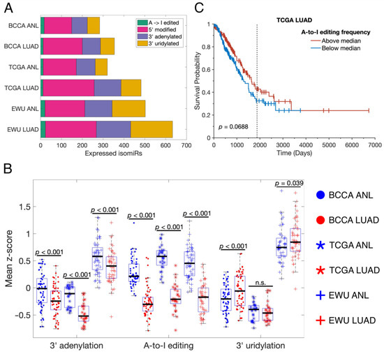 Paired-sample t-tests were used to assess whether various quantities (i.e., the expression of miRNA-modifying enzymes or the overall rates of miRNA modifications) in each cohort differed between paired ANL and LUAD samples, with a significance threshold of p < 0.05. When determining whether the frequencies of individual isomiRs differed between ANL and LUAD samples, a false discovery rate (FDR) threshold < 0.05 after BH correction was used instead.