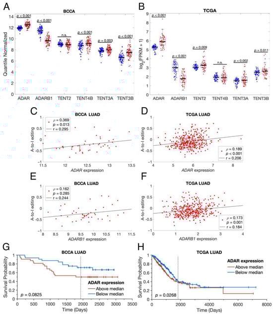 LUAD tumors alter their expression of miRNA-modifying enzymes. (A,B) Scatter-box plots showing the normalized expression of six different miRNA-modifying enzymes in ANL samples (blue points) and paired LUAD samples (red points). The displayed p-values resulted from paired-sample t-tests. n.s.: not significant, FPKM: fragments per kilobase of transcript per million mapped reads. (C–F) Scatter plots of sample-wide A-to-I editing rates vs. normalized ADAR or ADARB1 expression, where each point represents a single LUAD sample. mRNA expression normalization is identical to that shown in (A,B). Black lines are least-squares lines of best fit. The displayed p-values indicate the likelihood that, in an uncorrelated system, Spearman’s ρ would be as far or farther from zero than the displayed ρ. (G,H) Overall survival curves for BCCA LUAD (n = 64) and TCGA LUAD (n = 500) patients for whom mRNA expression and clinical data were available, stratified by their tumors’ ADAR expression. The displayed p-values resulted from log-rank tests. The graphical representations were generated using MatSurv [47]. The vertical line indicates the five-year mark. BCCA: British Columbia Cancer Agency, LUAD: Lung Adenocarcinoma; TCGA: The Cancer Genome Atlas.