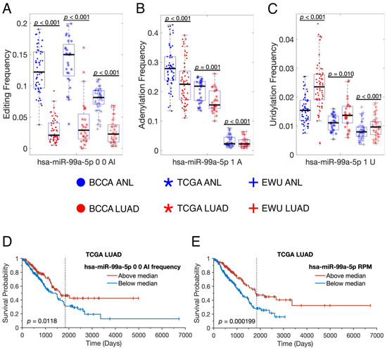 To provide an example of how individual miRNAs are modified differently in LUAD, we decided to look at the isomiRs of hsa-miR-99a-5p in more detail, as that miRNA has high-confidence sites of A-to-I editing, 3′ adenylation, and 3′ uridylation. In all three cohorts, hsa-miR-99a-5p was edited less frequently, adenylated less frequently, and uridylated more frequently in LUAD than in ANL (Figure 5A–C). As a result, the overall isomiR profile of hsa-miR-99a-5p, which could impact its mRNA targets and stability, was dramatically altered in LUAD. Higher editing of hsa-miR-99a-5p was associated with prolonged survival in the TCGA cohort, suggesting that the edited isomiR may collaborate with the unedited miRNA, which was also associated with prolonged survival and is a known tumor suppressor (Figure 5D,E) [49].