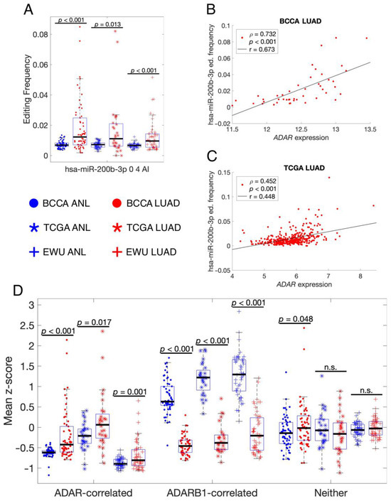 Only ADARB1-correlated edited isomiRs are less frequent in LUAD vs. ANL. (A) Scatter-box plots showing the editing frequency of hsa-miR-200b-3p 0 4 AI in different sample groups, which are indicated by the central legend. Each point represents a single sample, and only paired ANL and LUAD samples were included. The displayed p-values resulted from paired-sample t-tests. (B,C) Scatter plots of hsa-miR-200b-3p 0 4 AI editing frequencies vs. ADAR expression, where each point represents a single LUAD sample. Black lines are least-squares lines of best fit. The displayed p-values indicate the likelihood that, in an uncorrelated system, Spearman’s ρ would be as far or farther from zero than the displayed ρ. ed.: editing. (D) Scatter-box plots showing the rates of A-to-I editing for the three groups of high-confidence edited isomiRs delineated in Table 3. The same paired samples and sample groups were included as for (A), and the displayed p-values resulted from paired-sample t-tests. n.s.: not significant. ANL: Adult Non-malignant Lung; BCCA: British Columbia Cancer Agency; EWU: Ewha Womans University; LUAD: Lung Adenocarcinoma; TCGA: The Cancer Genome Atlas.