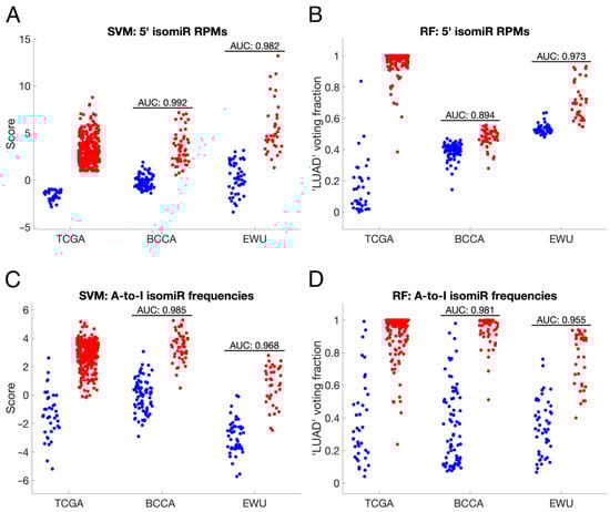 IsomiR-based classifiers accurately distinguish ANL and LUAD samples. (A–D) Plots of SVM scores and RF voting fractions for the training cohort (TCGA) and test cohorts (BCCA and EWU). Blue points represent ANL samples, and red points represent stage I/II LUAD samples. Each classifier was trained on either RPM or frequency data for one type of isomiR, as outlined in each panel’s title. SVM and RF hyperparameters were optimized prior to testing, as described in the methodology. AUC: Area Under the Receiver Operating Characteristic Curve; BCCA: British Columbia Cancer Agency; EWU: Ewha Womans University; RF: Random Forest; RPM: Reads Per Million; SVM: Support Vector Machine; TCGA: The Cancer Genome Atlas.
