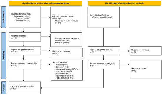 This review adheres to the guidelines set by the Preferred Reporting Items for Systematic reviews and Meta-Analysis (PRISMA) [16]. This study was not registered in PROSPERO. The PubMed® and EmbaseTM databases were searched on 10 June 2023 using the strings “lung cancer AND HPV”. The search was restricted to papers involving human subjects. SLR and meta-analysis will only be used for reference cross-checking. Results from these searches were combined, and duplicate entries were removed. Two authors independently reviewed the abstracts for all publications identified, and in the case of discrepancies, a third author made the final determination regarding the publication for this review.