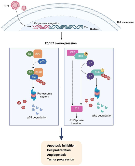 Figure 2. Possible molecular mechanisms of HPV pathogenesis of lung cancer [38,93,102,104]. Created with BioRender.com (https://www.biorender.com, accessed on 30 July 2024).