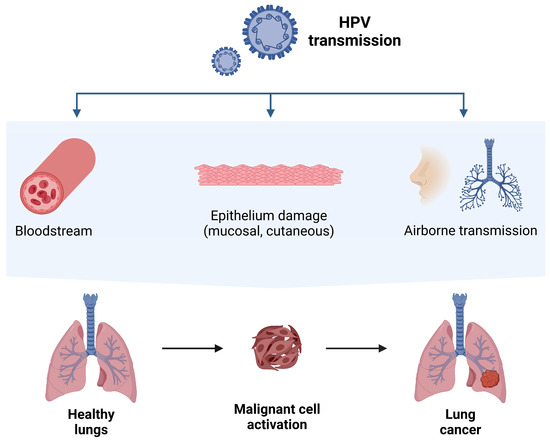 Figure 3. HPV transmission routes to the lungs. HPV DNA has been identified not only in human neoplastic lung cells, but also in serum, plasma, and peripheral blood mononuclear cells. Therefore, along with oral and airborne routes, the bloodstream itself could be one of the pathways of transmission from infected organs to the lungs [94,106,119]. The figure was created with BioRender.com (https://www.biorender.com, accessed on 26 September 2024).