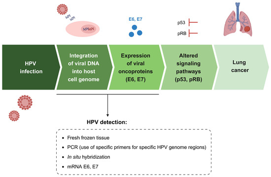 Figure 4. A schematic representation of HPV infection and lung cancer development. The recommended methods for HPV detection are crucial for an accurate diagnosis and include the preferable use of fresh-frozen tissue samples, the PCR technique with highly specific primers for specific HPV genome regions, in situ hybridization, and the evaluation of the expression of HPV E6/E7 oncogenes by means of mRNA detection. The figure was created with BioRender.com (https://www.biorender.com, accessed on 27 September 2024).
