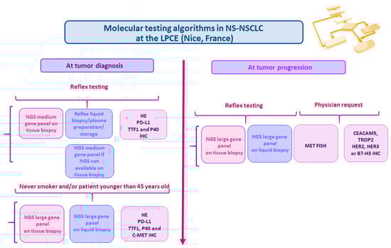 International guidelines for LB use in daily practice can be adapted according to the budget and reimbursement of testing, the institutions’ organization, the availability of the molecular pathology platforms, the expertise of the team, and the physicians’ requests. As an example, since 2020 in our institution (RespirERA University Hospital Institute, Nice, France), matched TB and LB are routinely performed at diagnosis (Figure 3). NGS are performed as reflex testing in advanced and metastatic NS-NSCLC with both TB and LB under the following conditions: (i) in never smoker patients, (ii) in young patients (i.e., less than 45 years old), and (iii) in case of an urgent need due to rapid tumor progression (Figure 3) [52]. For these cases, blood is centrifuged and the cf-DNA extracted from plasma is stored at −80 °C until potential future use, notably if the NGS performed on a matched TB is not informative. If NGS is not performed with extracted cf-DNA, the material is kept in the BB-0033-00025 biobank, which is ISO 20,387 certified [79], for further use (notably for inclusion into research projects, including those dedicated to benchmarking of different NGS panels). An LB is systematically performed at tumor progression, notably in patients receiving targeted therapy (Figure 3). In this context, a tissue rebiopsy ideally oriented on the site of tumor progression should be performed in the absence of clinical contraindication. This allows rapid diagnosis of a possible transformation of a histological type (in small cell carcinoma or in squamous cell carcinoma) and, in our institution, to perform systematically a MET FISH at tumor progression under TKIs.