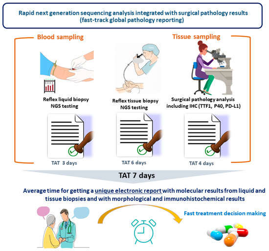 At the IHU RespirERA, different NGS panels are used: (i) a small (12 genes) and a medium (50 genes) panel at tumor diagnosis both with a TB and LB; (ii) a large panel (324 or 670 genes) with a TB systematically at tumor progression or at diagnosis in never smokers and young patients; (iii) systematically a large panel (170 genes) with an LB at tumor progression (Figure 3). In this context, it is challenging to integrate all the results obtained from a TB and LB in the same report, including the pathological data (with the different IHC results). Therefore, the development of new sequencing technologies (such as the so-called “ultra-fast” NGS) and the improvement of automation of the preanalytical and analytical phases has led more and more to a report containing all the information at the same time for optimal treatment decision-making [80,81,82] (Figure 4). Moreover, NGS reflex testing is certainly an important option to save time for optimal treatment decision-making [83]. In our institution, both NGS with a TB and LB are performed as reflex testing. The practice of this reflex testing is guided by the adherence to a protocol, defined and agreed to by the multidisciplinary team, in accordance with local circumstances and institutional authorization. Where possible, comprehensive reflex biomarker testing, via NGS and IHC, is performed for all patients diagnosed with NSCLC (including squamous cell lung carcinoma), and irrespective of the stage of the disease. In our institution, we were able to set up reflex NGS from both TB and LB in NSCLC thanks to a collaborative project with the physicians, the Nice University Hospital, the FHU OncoAge, and more recently with the IHU RespirERA, all participating in the cost associated with these tests. Moreover, part of the cost is funded through state resources coming from the budget of the French government. Thus, since 2020, more than 500 NSCLC patients can be tested at diagnosis each year using a medium gene panel. Since currently it is certainly mandatory to look for the status of 9 genes (EGFR, BRAF, ALK, ROS1, MET, RET, HER2, KRAS, and NTRK) in NS-NSCLC, it would also be possible to use a small NGS panel. However, we decided to use a larger panel of 50 genes at tumor diagnosis in order to have a larger molecular portrait of the tumor, including information on the main exons of TP53 (since TP53 mutations may have an impact soon on treatment decision-making), but also on other potential therapeutic targets associated with genomic alteration on different genes such as NRG1, PI3KA, and other genes. Moreover, mutations on some genes, such as STK11 and KEAP1, can have an impact on the treatment efficiency.