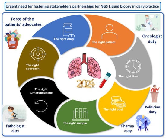 Optimal routine use of LB for lung cancer patients is facing different challenges. One major issue of using a LB in daily practice for lung cancer patients is certainly the cost and the absence of reimbursement, notably when using NGS, and the perspective of this cost when monitoring the disease in targeted treated NSCLC patients and the repetition of the blood sampling. Moreover, LB could soon be used to monitor all lung cancer histological subtypes, such as small cell lung carcinoma, and to detect new therapeutic targets thanks to the assessment of different molecular biomarkers [86]. Finally, besides using an LB for the detection of genomic alterations associated with potential targeted therapies, LB could be used more and more when administering immunotherapy to evaluate the therapeutic responsiveness and new resistant mechanisms [97,98,99]. As mentioned above, one major goal is to integrate the practice of doing LB into the daily standard of patient care, which is economically quite difficult in terms of sustainability, notably since the reimbursement of these blood tests is not certain in most countries [100]. Therefore, the different stakeholders, including the politicians, the pharmaceutical and biotechnological companies, but also the advocates of patients, the physicians, and the molecular pathologists, need to work together to rapidly find solutions for molecular testing with TB and extend the use of LB in all countries [100] (Figure 5). One major possibility could be to have a strong commitment of different pharmacology companies at the national or at the international levels for participating in the budget associated with NGS LB. These companies could be organized in large consortia working together with different official authorities (such as the ministries of health or the national cancer institutes) in order to regulate the cost and the implementation of LB in the health care system.