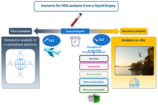 This latter option is, from our personal point of view, an urgent need, and offers several advantages: (i) a shorter TAT to obtain the report, (ii) lower costs, (iii) complete mastering of the raw data, and the opportunity for a biobank to use the leftover nucleic acid for immediate reanalysis or ancillary studies, (iv) an optimization of the «green vision» concerning the different steps of the workload, including a decrease in sample transportation from one site to another (notably by plane) (Figure 6). The increase in the number of therapeutic targets, and also of the different clinical trials in thoracic oncology, has progressively led to more frequent use of large panels of genes with several hundred genes, so-called comprehensive genomic profiling (CGP) panels. When using LB, these large panels need to be run on specific and costly instruments such as the Novaseq 6000 (Illumina) to be able to deeply sequence the low amount of nucleic acid. The usefulness of these CGP for LB is of great interest at tumor progression for patients on targeted therapies, since the resistance mechanisms are more and more complex and since there are different options for patient inclusion into clinical trials, notably into a phase I trial [107,108]. There is an urgent need to integrate complementary tests such as liquid and tissue data into the same report at the same time to provide the entire biomarker landscape to the physician [109]. In this context, it is of strong interest to follow different international guidelines and recommendations for reporting both tissue and liquid biopsy NGS results, together with different IHC data [not only concerning PD-L1 expression in tumor cells, but also the expression of other soon-to-be developed biomarkers, notably different proteins targetable by ADCs, such as c-MET] (Figure 4) [109]. Considering the use of these large panels of genes both with TB and LB, it will be important in the future, to facilitate treatment, to use soft reports with links to big data such as large-scale genomic/transcriptomic/proteomic databases. Finally, these reports have to integrate the impact of comutations on targeted therapies and immunotherapies and the possible primary and secondary resistance mechanisms [25]. However, thanks to this increase in the complexity of interpretation of genomic alterations, it is now mandatory to provide an easier way for the physician to use guidelines for interpretation of the results [110,111]. Finally, it is noteworthy that despite the potential that NGS, in particular with LB, offers for diagnosis and adapting personalized therapy, only a few patients benefit from this approach, at least in France and many countries in Europe, because of the failure of the health care system and policymakers to implement them in daily practice. Thus, it is urgent to convince different stakeholders, at least financial authorities, that LB NGS should now be performed not only in clinical trials, but also routinely for clinical care of NSCLC patients [112]. One point to highlight here is that as for TB NGS, when doing LB NGS both in daily practice but also in clinical trials, the physicians must obtain the signed consent form from patients. However, this process is burdensome since consent forms are not easily readable for patients, and the time necessary to complete the consent process can be a barrier to participation [113]. Thus, the consent process associated with the LB NGS obtention needs to be improved to make it more responsive to the needs of participants. One major issue is certainly to be able to make an LB in low-funding countries, low-resource institutions, and in the absence of national reimbursements. Narrowing the huge existing disparities in incorporating NGS LB into healthcare systems urgently requires different initiatives. The optimization of education, the establishment of standardized procedures, the allocation of resources, and infrastructure investment are some of the current challenges for NGS LB implementation in certain countries. Moreover, the promotion of strong collaboration and support, among distinct groups of stakeholders, including pharmacology companies, is pivotal to helping low-funding countries to be able to develop LB use. Probably LB use in thoracic oncology daily practice could be more restrictive in some countries and thus limited to tumor progression only or in case of not any possibility to have access to a tissue biopsy.