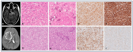 The first case concerns a 6.5-year-old girl who consulted for focal seizures with impaired consciousness. Magnetic Resonance Imaging (MRI) showed an intra-axial left mesial temporal tumor with solid and several small cystic components. The lesion was conspicuously hyperintense on T1-weighted images, and showed only modest contrast enhancement (Figure 1). Subtotal surgery was performed. Histopathological examination revealed a well-defined tumor. The lesion was heterogeneous with a predominant storiform growth pattern. The tumor cells were spindle-shaped with intermixed giant cells. Throughout the specimen, lymphocytes, plasma cells and eosinophilic granular bodies were present. There were calcifications, but no necrosis was observed. The mitotic activity was low (1 mitotic figure/2.3 mm2). Most of the tumor cells were positive for the glial fibrillary acidic protein (GFAP), CD34 (diffuse cytoplasmic and membranous positivity), with focal expression of Neu-N and synaptophysin on immunohistochemical analysis (IHC). Based on the morphological aspect and the IHC profile, we proposed the diagnosis of a pleomorphic xanthoastrocytoma (PXA), WHO grade 2. Additional tyrosine kinase (panTRK) IHC showed strong cytoplasmic staining with membranous accentuation. Targeted next-generation sequencing (NGS) (Supplementary Material S1) showed no BRAF, RAS or other mutations. RNA sequencing (Supplementary Material S1) revealed a TPM4 (exon 7)::NTRK2 (exon 15) fusion. Genome-wide DNA methylation analysis was performed using the Illumina Infinium MethylationEPIC BeadChips, but unfortunately, DNA methylation testing was not contributive. The patient received no adjuvant therapy [9]. To date, five years after surgical treatment, no progression has been seen on MRI.
