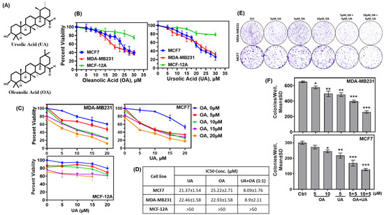 Pentacyclic triterpenes (PTTs) UA and OA induced cytotoxicity in normal breast epithelial cells and BrCa cells. (A) Chemical structure of UA and OA. (B) Cytotoxicity of OA and UA on MCF-12A (normal mammary epithelial cell line), MCF7, and MDA-MB231 cells. Surviving fractions after 72 h incubation with OA (left panel) and UA (right panel) were estimated by MTT-reduction colorimetric assay. (C) Surviving fractions (%) of BrCa cells and MCF-12A cells at various combinations of OA and UA. (D) Summary of IC50 of OA and UA on BrCa and MCF-12A cells. (E) Inhibition of clonogenic potential of BrCa cells treated with OA, UA, and both: colonies of surviving cells formed in 7 to 10 days following treatment with UA, OA, and both for three days. (F) Quantitative analysis of colonies/well (mean ± SD, n = 3) for MDA-MB231 and MCF7 cells. Pairwise t-tests were used to determine significance: * p < 0.05, ** p < 0.005, or *** p < 0.001 with untreated cell colonies as control.