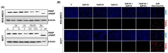 Lack of apoptotic activity in OA- and UA-treated BrCa cells. (A). Apoptotic activity visualized as changes in cleaved PARP by immunoblotting analysis showed a lack of cleaved PARP (c-PARP) in MDA-MB231 and MCF7 cells treated with OA, UA, and both. However, cells treated with 2 µM staurosporine (Sta) showed cPARP. β-actin bands reference the uniform loading of cell lysates in all electrophoretic blot lanes. Original images of western blots are shown in Supplementary Materials File S1. (B). DNA fragmentation levels in situ due to apoptosis were analyzed in BrCa cells by the TUNEL (terminal deoxynucleotidyl transferase dUTP nick-end labeling) assay. DNA fragmentation fluoresced red, and cells with intact nuclei did not. Cells treated with PTTs did not fluoresce, but those treated with staurosporine did, indicating an absence of apoptosis in PTT-treated cell cultures (Magnification: 100×).