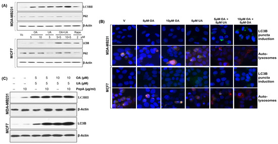 The expression of LC3B and its externalization as LC3BII in the puncta were observed following immunofluorescence labeling with anti-LC3B antibody. LC3BII localization in the puncta is an indicator of increased autophagic flux. The autophagosome formation seen in MCF7 and MDA-MD231 cell cultures treated with OA, UA, and OA + UA or rapamycin (Figure 3B, first and third panels) shows increased autophagy following drug treatment.