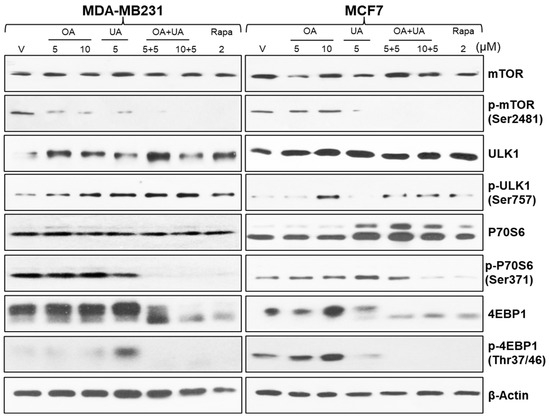 Autophagy constitutes an intricate biological process characterized by the orchestrated involvement of diverse proteins operating sequentially. We analyzed the cell lysates prepared from BrCa cells (MCF7 and MDA-MB231) treated with several doses and a combination of OA, UA, and rapamycin. The mammalian target of rapamycin (mTOR) is a crucial regulator of signals involved with protein synthesis, cell growth, and metabolism. It is also a master regulator of autophagy [37,38]. Under a normal state, mTOR is associated with other induction complexes (ULK1 and Atg13). It is reported that inhibition of mTOR phosphorylation (phospho-mTOR, p-mTOR) induces autophagy. As shown in Figure 4, the levels of p-mTOR (p-Ser2481) were significantly reduced in UA- and OA + UA-treated cells of both MCF7 and MB-231 lines, but OA did not inhibit p-mTOR.