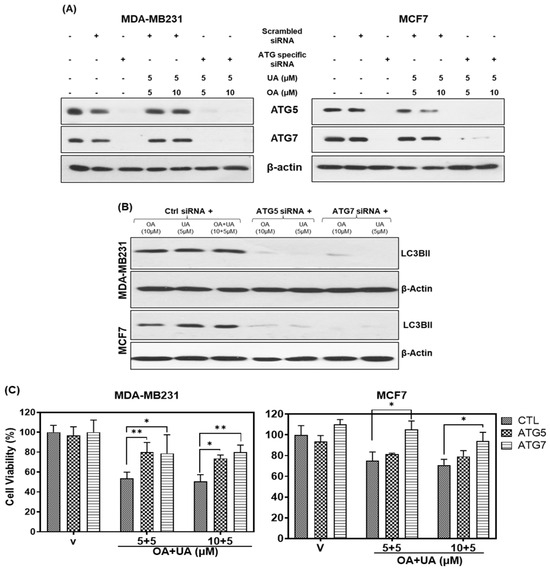 Human-specific small interfering RNA (siRNA) for ATG5 and ATG7 and scrambled siRNA were purchased from a vendor (Dharmacon, Thermo Fisher Scientific Inc., Waltham, MA, USA). The MCF7 andMDA-MB231 cells were cultured in 6-well plates and transfected with siRNAs using Lipofectamine™ 2000. Transfected cells were treated with UA, OA, and both for 48 h. Treated and control cultures with or without specific ATG siRNA were harvested to make cell lysates and assess viability following OA and UA treatment. Protein expression for ATG5 and ATG7 in control siRNA and specific siRNA transfectants was determined by Western blotting. An MTT-reduction assay was used to estimate cell viability after silencing these genes.