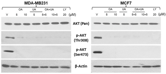 PTTs downregulate AKT activation. Western blotting analyses were performed to estimate the extent of activated AKT (phosphorylated (Thr308) and Ser473) and total AKT in whole-cell lysates of MDA-MB231 and MCF7 cells. The cells were treated with OA, UA, and both with or without LY94002 (PI3K inhibitor). β-actin is used as an internal loading control. Original images of western blots are shown in Supplementary Materials File S1.