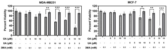 We next examined whether autophagy inhibitors would negatively regulate OA-, UA-, and OA + UA-induced autophagic death. We used a low dose of 3-methyladenine (3MA), which inhibits autophagosome formation and promotes autophagy progression. Regarding cell viability in the presence and absence of 0.1 µM 3MA and various OA, UA, and OA + UA doses, we observed that co-incubation of OA, UA, and both in the presence of 3MA nearly abolished the cytotoxic lethality of OA, UA, and OA + UA (Figure 7). Although the common dose of 3MA used in such experiments was ≥5 mM, 3MA was able to inhibit autophagy-induced cell death completely in both MDA-MB231 and MCF7 cells.