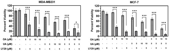 The PI3K inhibitor LY294002 enhances the cell death induced by pentacyclic triterpenes (PTTs). MTT assay-based cell viability was measured after treatment with OA, UA, and both with and without LY294002 (LY29); a specific inhibitor of PI3K) in both the BrCa cell lines. LY29 boosted the cytotoxicity induced by the PTTs. Results are expressed as means ± standard deviation (SD) (n = 3), and pairwise t-tests were used to determine significance: p < 0.05 = *, p < 0.001 = ***.