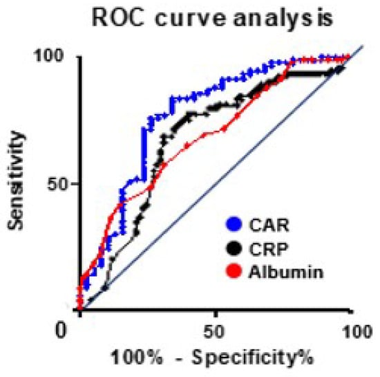 The area under the curve of the C-reactive protein (CRP)-to-albumin ratio, CRP, and albumin value were compared by receiver operating characteristic curve analysis. With a CAR cutoff value of ≥0.05, the sensitivity and specificity were determined to be 71.4% and 76.3%, respectively.