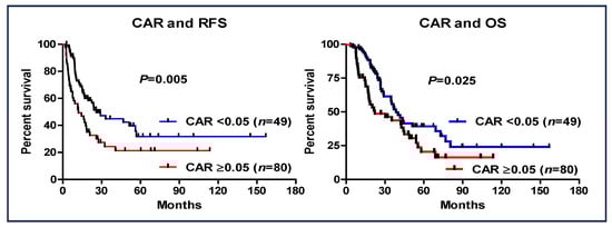 The prognostic value of a CAR of <0.05 was investigated (Figure 3). Patients with a CAR of ≥0.05 had worse RFS (95% CI: 0.418–0.859, HR: 0.599, p = 0.005) and OS (95% CI: 0.342–0.747, HR: 0.506, p < 0.001) than those with a CAR of <0.05. Additionally, in the entire cohort of patients who received S-1 as AC (n = 172), a CAR > 0.05 was also shown to be a significant prognostic factor (Figure 4).
